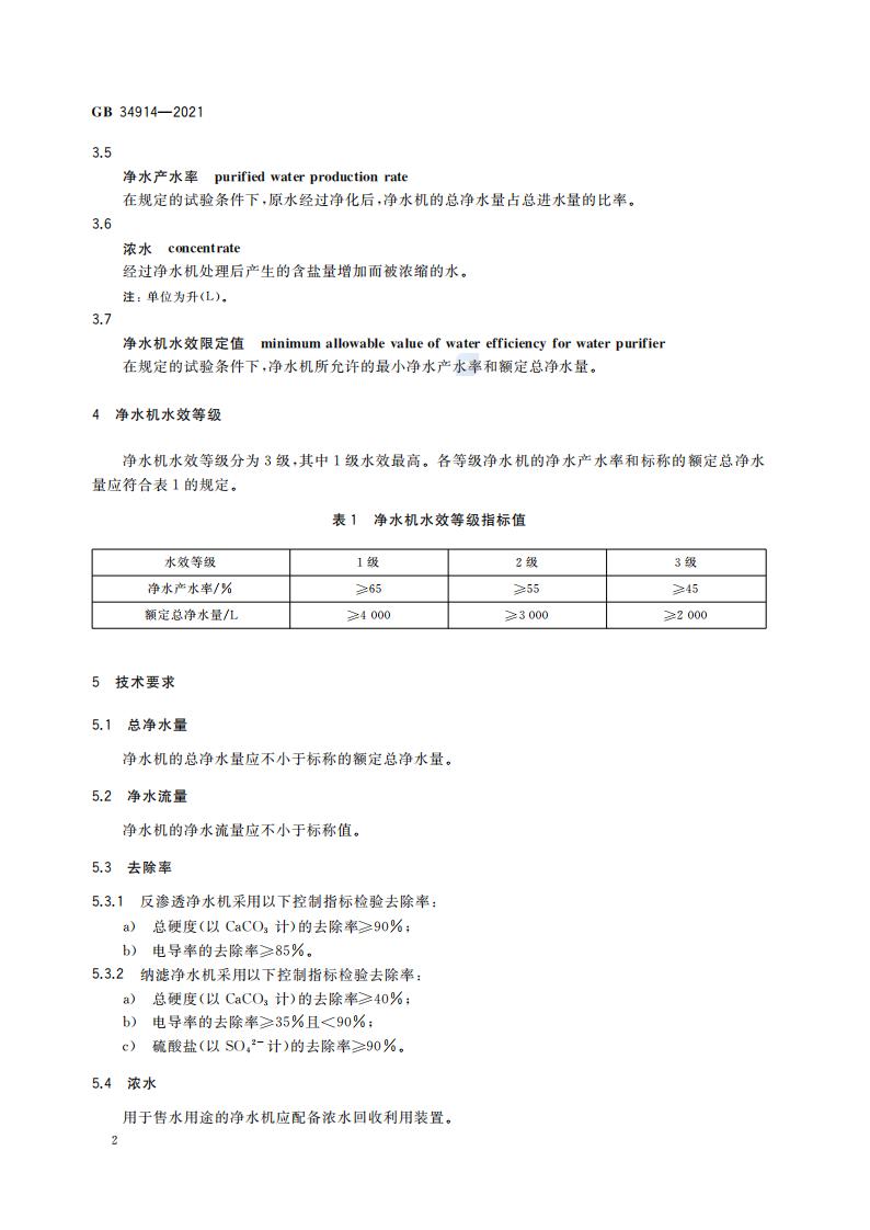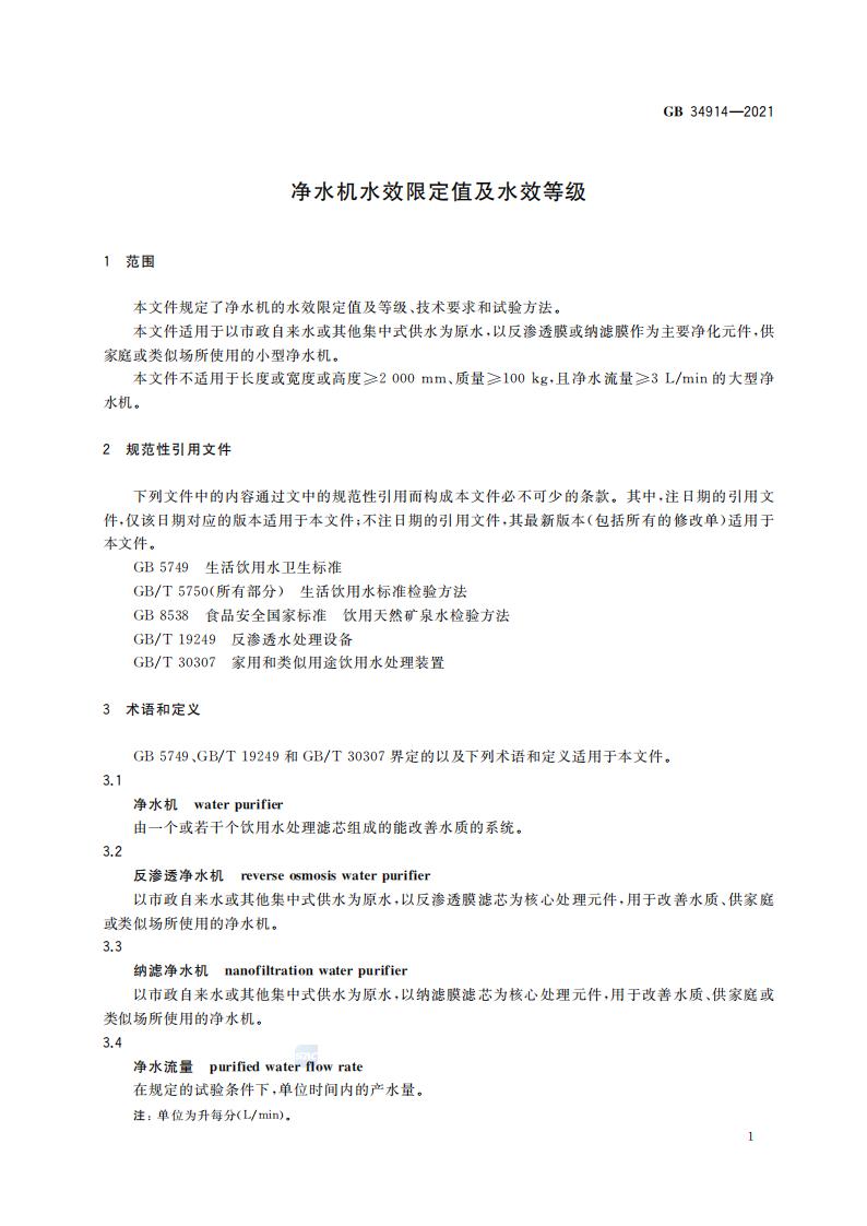 净水机水效限定值及水效等级 GB+34914-2021